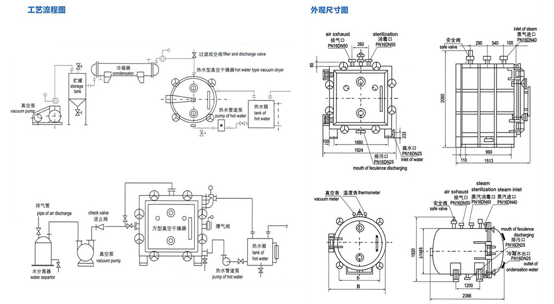 1.干燥器身:根據(jù)不同的生產(chǎn)要求,干燥器身可由A3鋼板或A3鋼板內(nèi)貼1Cr18Ni9Ti不銹鋼板或1Cr18Ni9Ti不銹鋼板制作。1Cr18Ni9Ti不銹鋼板器壁便于清洗,有利于達(dá)到藥物的無(wú)菌要求,對(duì)酸堿具有良好的防腐蝕作用。器身前后設(shè)有三個(gè)視鏡,便于觀察物料干燥情況,視鏡襯墊系由硅橡膠制作,既密封又適用藥物無(wú)毒干燥要求。器身上設(shè)有真空表和溫度計(jì),還設(shè)有消毒口,用于對(duì)物料干燥前或干燥中后期的消毒和保護(hù)。消毒氣體和保護(hù)氣體由用戶自擇,消毒過(guò)程中必須關(guān)閉真空泵與真空閥門,消毒結(jié)束關(guān)閉消毒口后,才能開啟真空泵打開真空閥門抽真空。如需無(wú)菌操作,應(yīng)配備蒸汽過(guò)濾器(用于消毒口)及空氣過(guò)濾器(用于放空閥口)??紤]到消毒口輸入蒸汽壓過(guò)高,器身上還裝有安全閥用于保護(hù)。器身上設(shè)有一個(gè)蒸汽進(jìn)口(或熱水出口),器身底下設(shè)有疏水器接口(或熱水進(jìn)口)排污口。